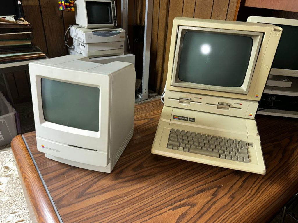 Vintage computers, including a Mackintosh classic and Apple 2E, IBM personal computers, and 2 IBM mechanical keyboard boxes.